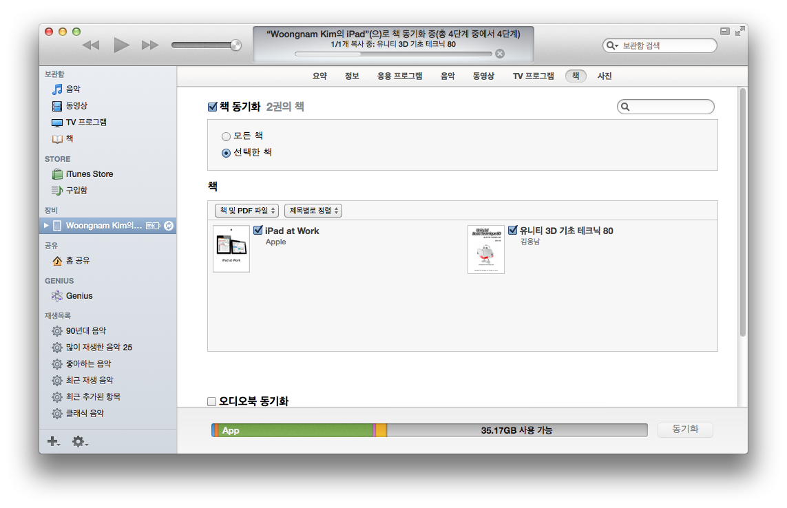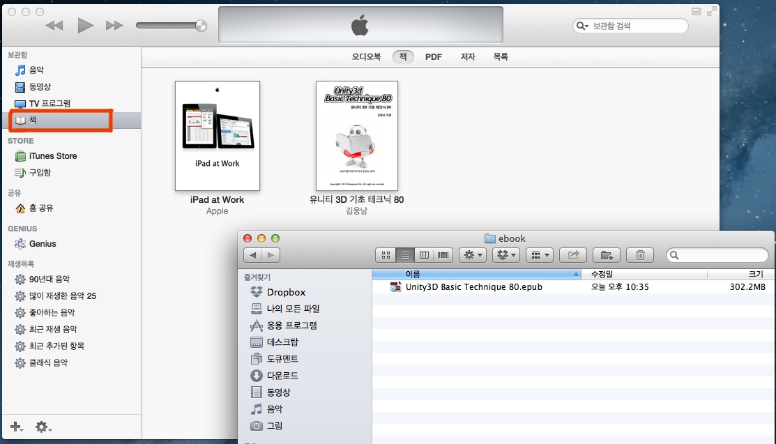 우선 아이튠즈를 실행하신 뒤, 왼쪽 상단의 항목 중 ‘책’을 선택합니다. 그리고 우측의 빈 공간에 다운로드 받으신 epub3 포멧의 파일을 드래그해서 갖다 놓습니다. 그리고 나서 아이패드를 연결한 뒤, 동기화 시키면 됩니다.